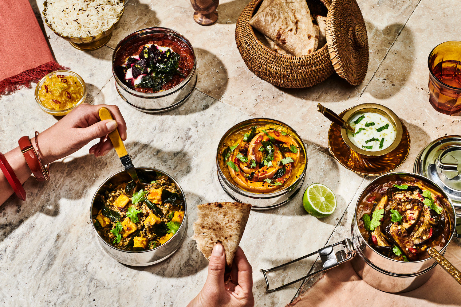 Each dabba has enough food for two, and includes chutney, curry, dal and rice, all made with fresh, bold ingredients.